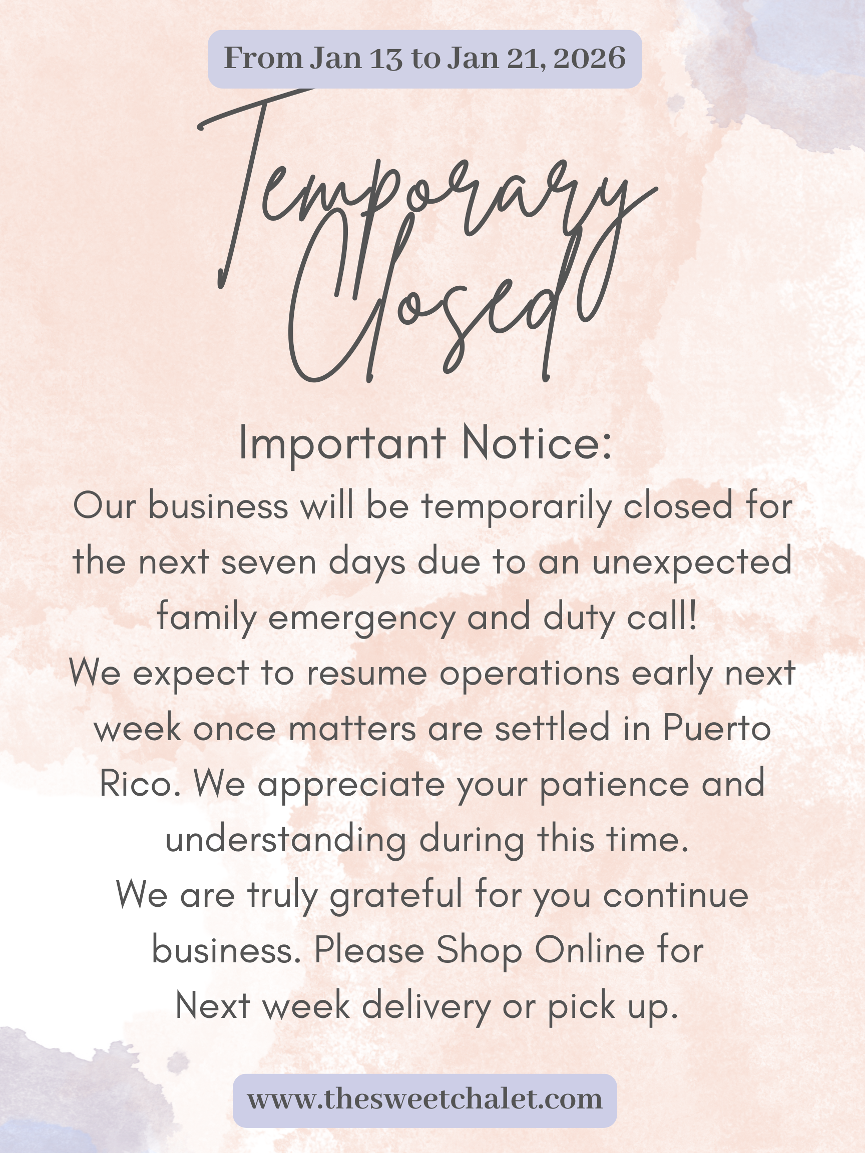PLEASE TAKE NOTES: Your Order Shipping can be affected this week... Shipping will resume next Friday Jan 24th, 2025.